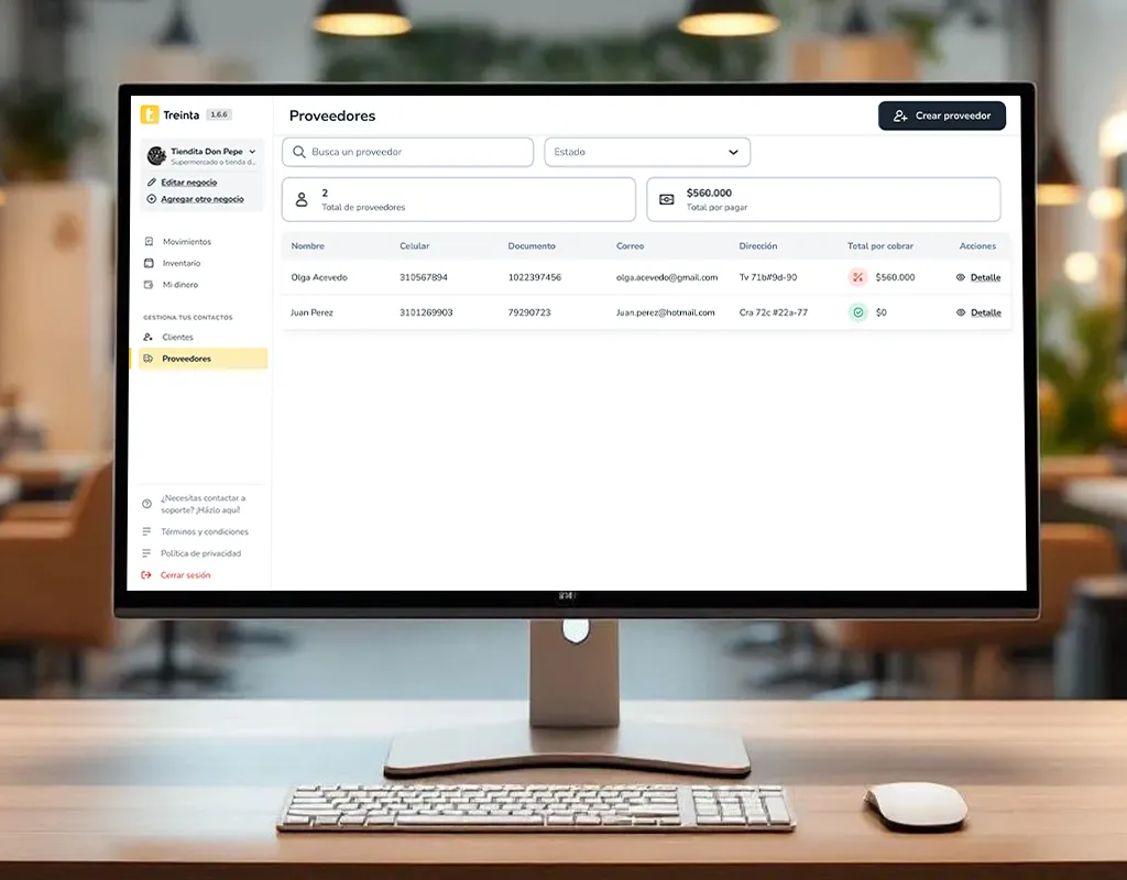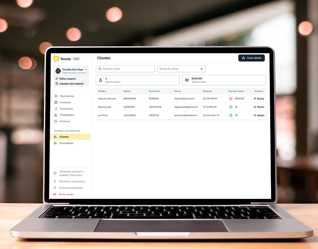 Si un cliente se fue sin pagar o pagó solo una parte, registras la deuda en el sistema. Treinta te muestra quién te debe, cuánto y desde cuándo. Puedes registrar abonos parciales y hacer seguimiento hasta que la cuenta quede saldada.