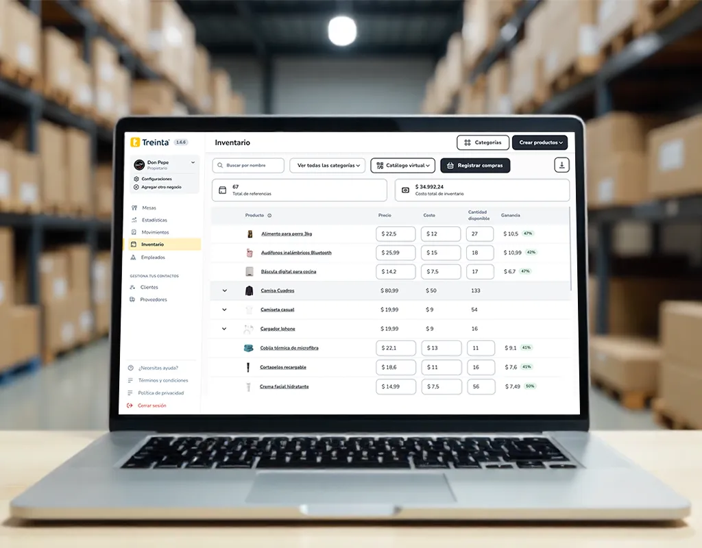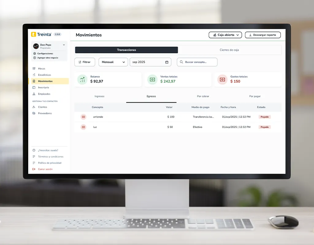 Registra los gastos del negocio: compra de insumos, arriendo, nómina, servicios públicos u otros. Treinta los categoriza para que puedas ver en qué está saliendo el dinero y compararlo con tus ingresos.
